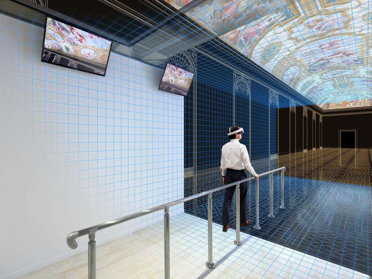 「みどころウォーク」は、ヘッドマウントディスプレイを装着した利用者が、手すりをたどりながら実際に移動することでVR空間内を動き回ることができる鑑賞システムです。現実と少し異なる映像で錯覚を起こすことで仮想的に物理空間を拡張し、限られた展示空間内でも、広大な仮想空間を移動する体験が行えます。