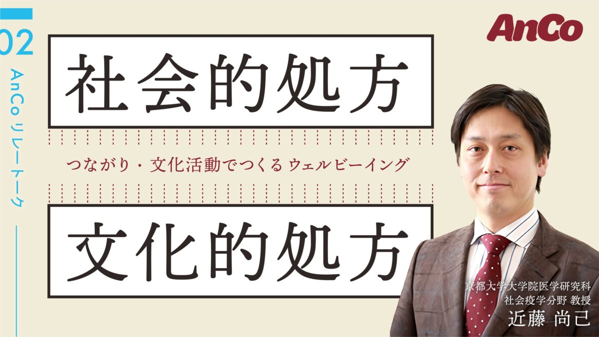 後半は、地域文化活動のアップデートとテクノロジーによる活動創出についての前半のプレゼンテーションを踏まえてディスカッションを行いました。 司会進行●近藤 尚己(AnCo代表理事、京都大学大学院 医学研究科 社会疫学分野 教授) ディスカッションメンバー日彰地区自治会(京都市中京区) / 京都市 / …